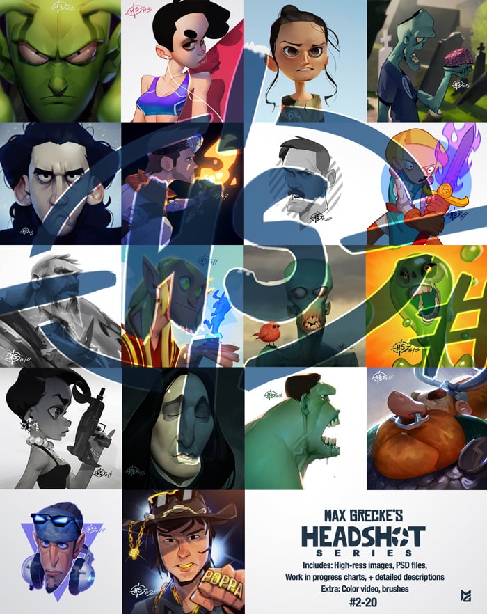 Pluss the bonus content which are a time lapse video where Headshot #104 is colored, and the basic brushes I use for the creation of these.